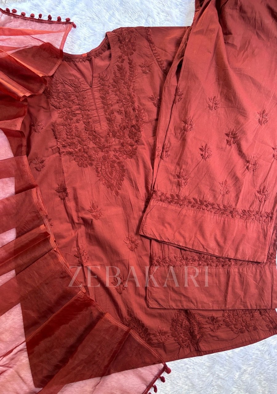 Dia Viscose Resham Jaal Chikankari and Mukesh Work 3pc Set- Rose Red