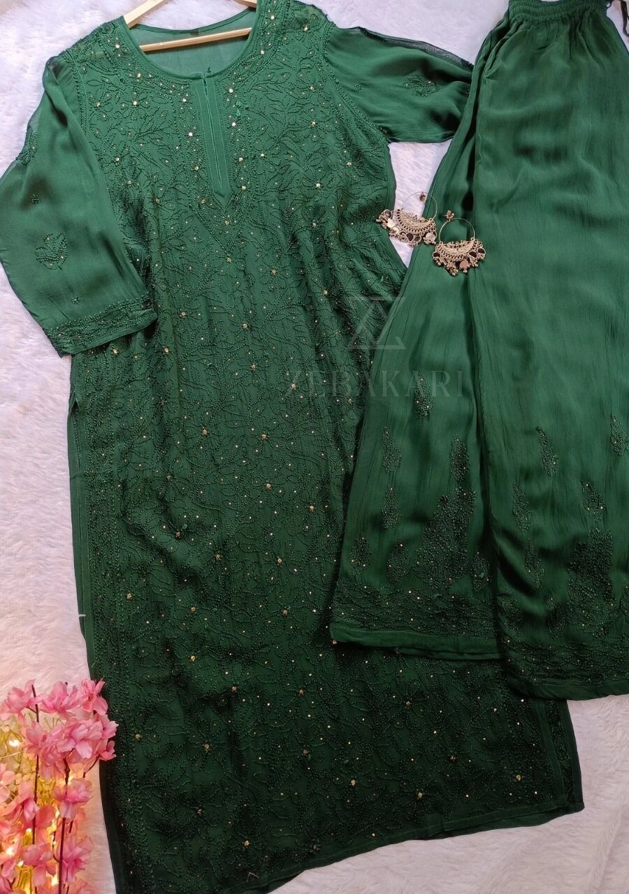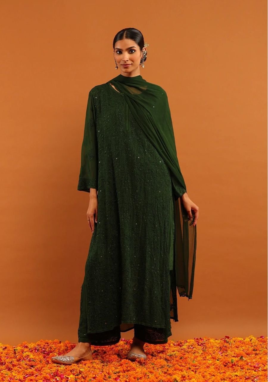 Dia Viscose Resham Jaal Chikankari and Mukesh Work 3pc Set- Bottle Green
