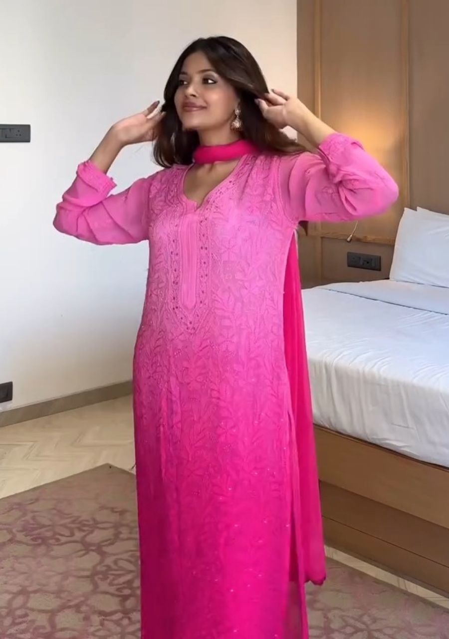 Dia Viscose Resham Jaal Chikankari and Mukesh Work 3pc Set- Ombre Pink