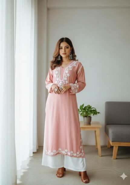 A sleek and elegant rayon Chikankari kurti with intricate sleeve embroidery and subtle border work—