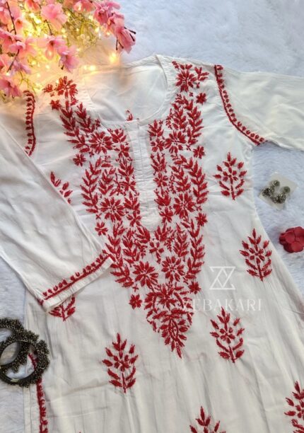 Sadiya Cotton Chikankari Long Kurti- Red