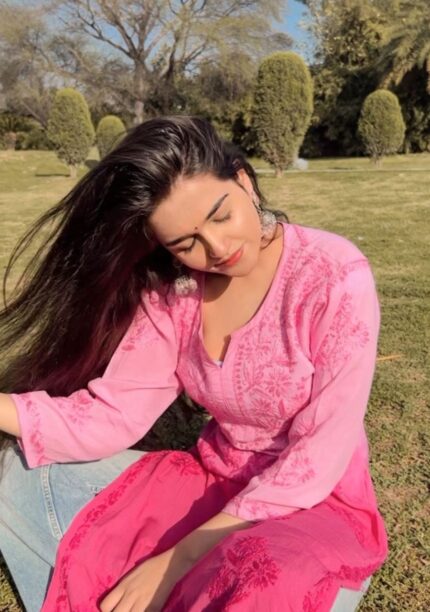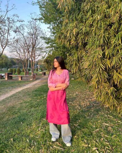 Iqra Pink Chikankari Modal Long Kurta