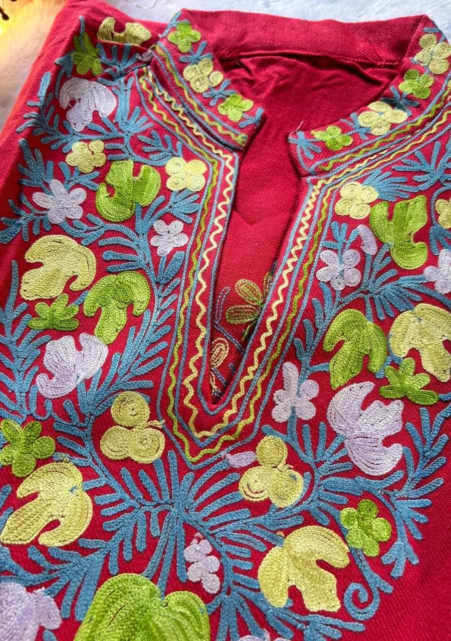 Stay cozy and stylish with our Kashmiri Aari Work Pheran Kurta, beautifully crafted from soft, warm cashmilon wool. Adorned with intricate hand embroidery, this traditional piece features both-side pockets for added comfort and convenience.