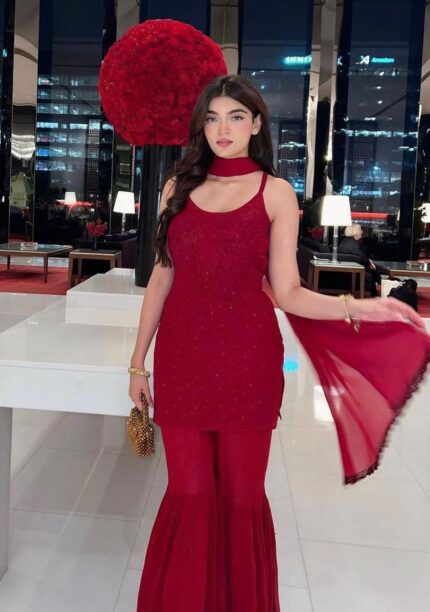 Dia Viscose Resham Jaal Chikankari and Mukesh Work 3pc Set- Rose Red