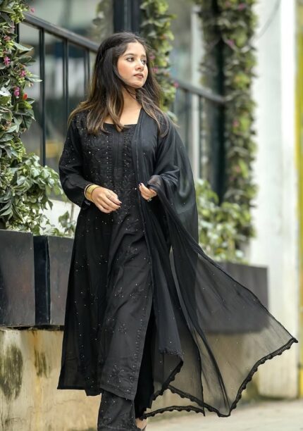 Dia Viscose Resham Jaal Chikankari and Mukesh Work 3pc Set- Black