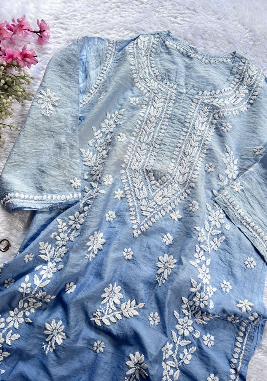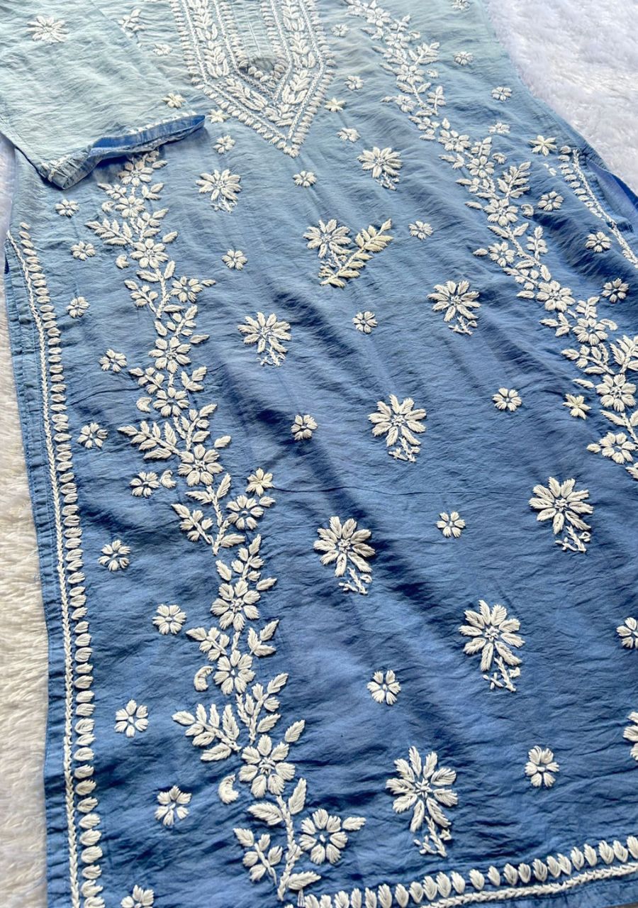 Naina 3D Chikankari Chanderi Long Kurti – Ombre Blue