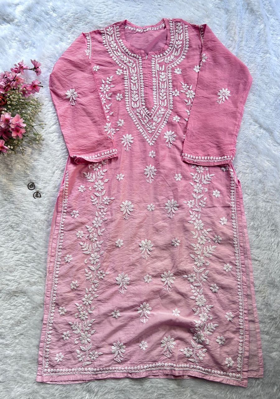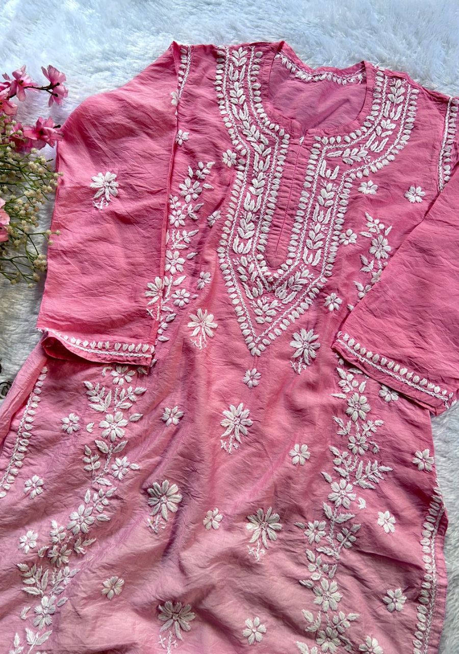 Naina 3D Chikankari Chanderi Long Kurti – Ombre Pink