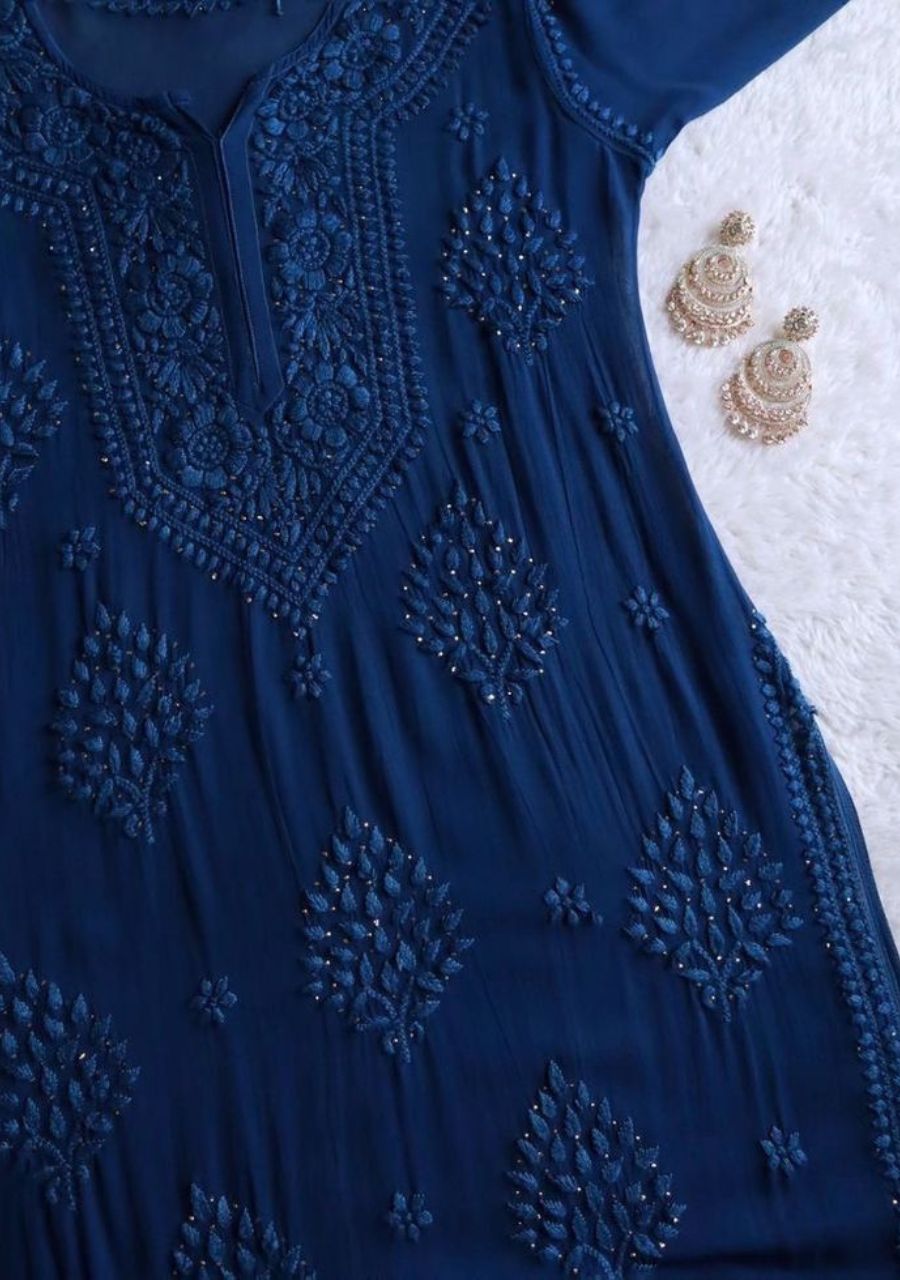Feriha Chikankari Modal Long Kurti- Navy Blue