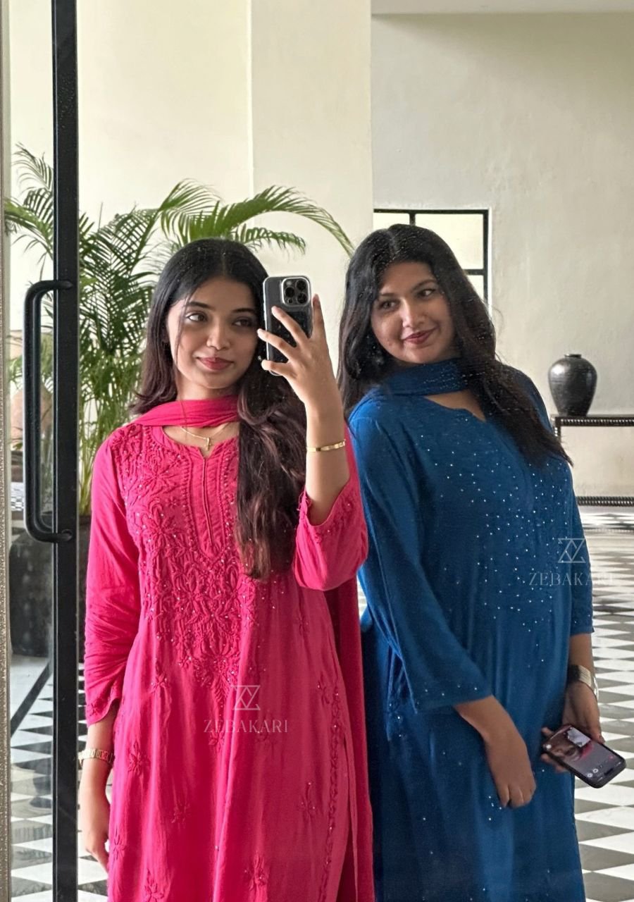 Noor Chikankari Mukesh Work Rayon Long Kurti Set with Dupatta – Blue