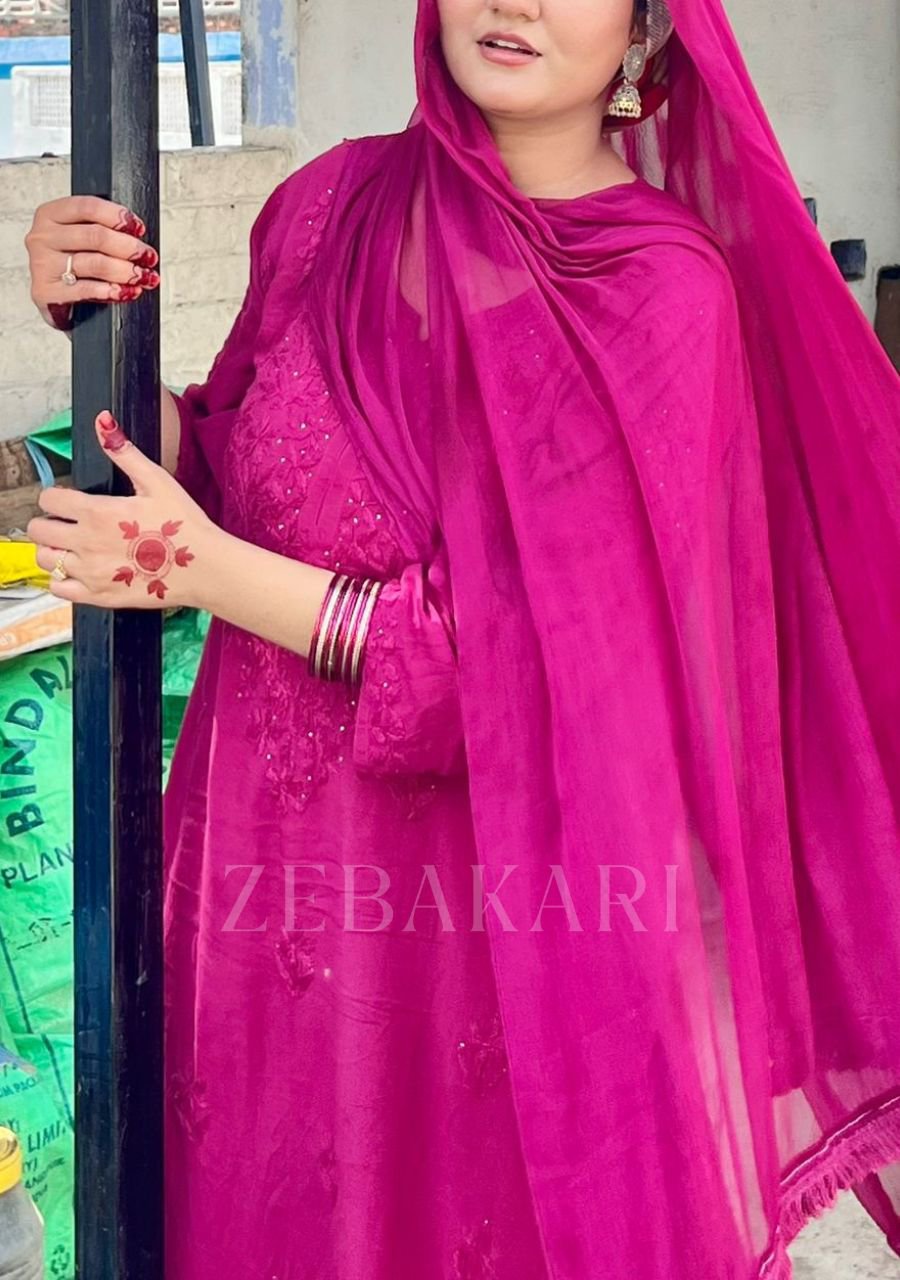 Dia Viscose Resham Jaal Chikankari and Mukesh Work 3pc Set- Rose Red