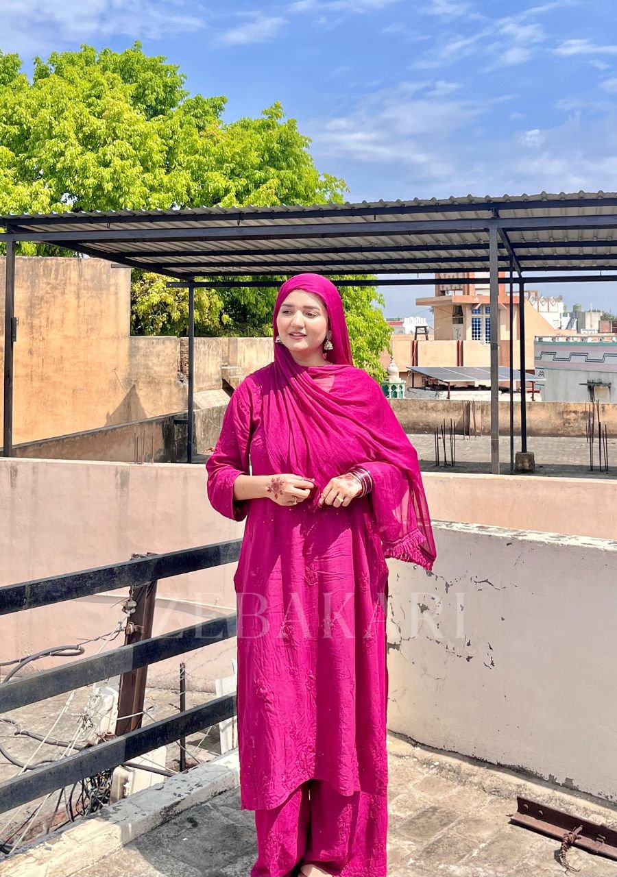 Stylish and elegant, this 3-piece suit features timeless Chikankari hand embroidery with delicate Mukesh embellishments. Designed in a flowing silhouette, it’s perfect for festive formals and effortlessly channels that Desi girl charm.