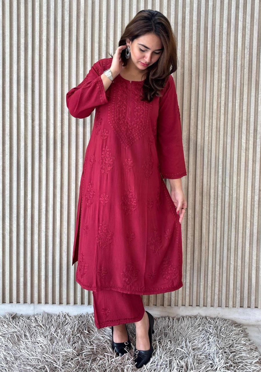 Palak Chikankari Rayon Co-ord Set- Maroon