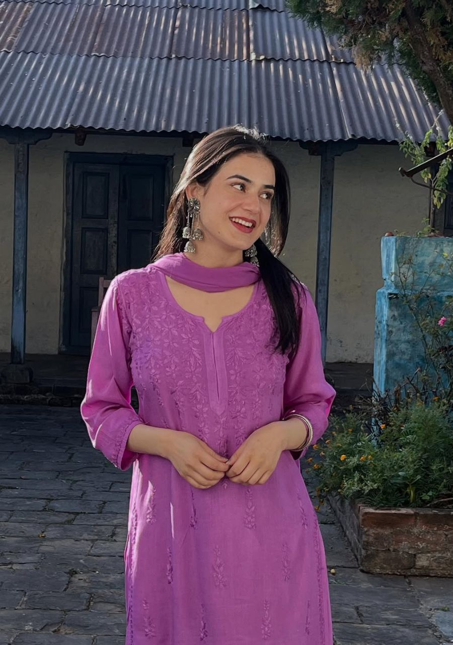 Palak Chikankari Rayon Long Kurti Set with Dupatta – Lavender