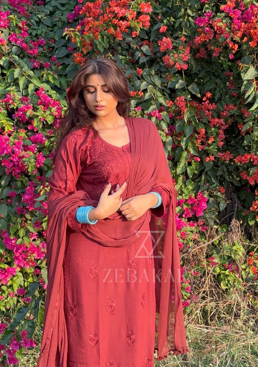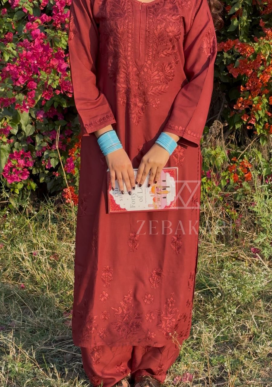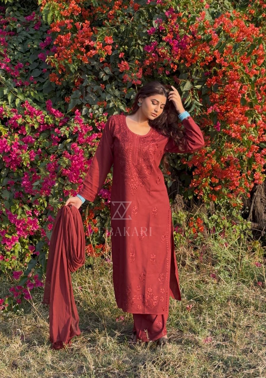 Palak Chikankari Rayon Long Kurti Set with Dupatta – Terracotta Brown