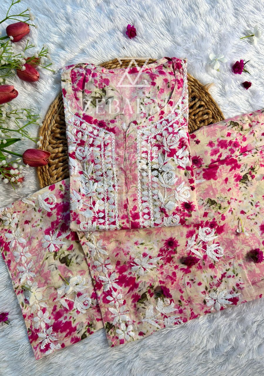 Ruby Mulmul Chikankari Printed 2 PC Long Kurta Set – Pink