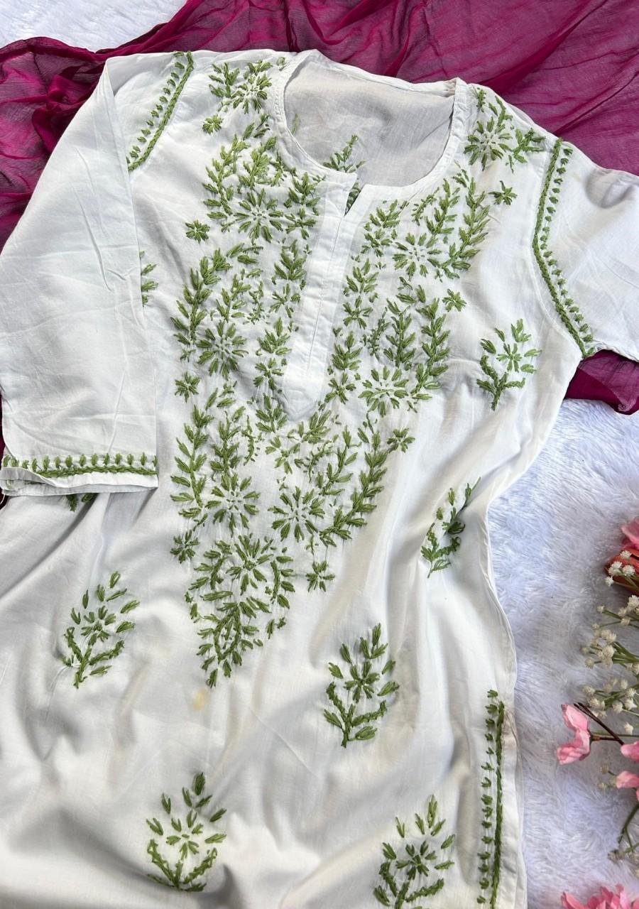 Summer’s favorite white cotton kurti with colorful chikankari handwork—lightweight, airy, and perfect for any summer outing.