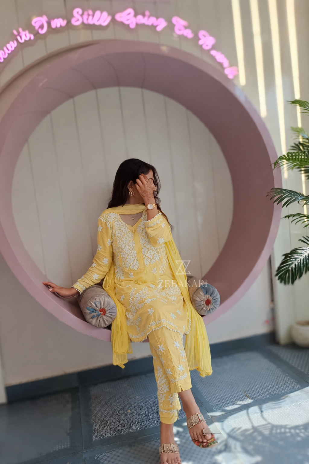 Zeeba Modal 3D Chikankari Co-ord Set- Butter Yellow
